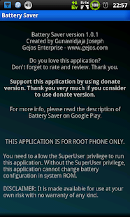 : Battery Saver will change the system ROM configuration for better battery life.Unlike other simillar applications do, this application will not cut-off the mobile, wifi, etc connections while sleep, will not slow down the data connections, will not slow down the processors, etc. but this application will configure for the best battery settings in the system ROM for better battery life.